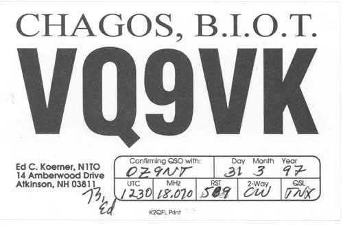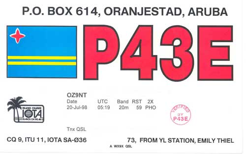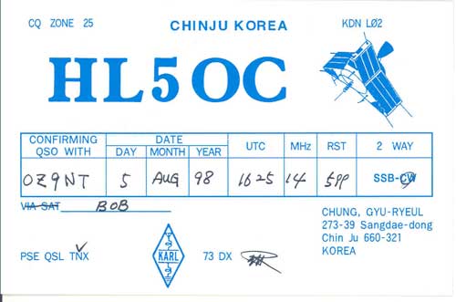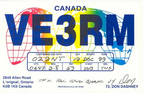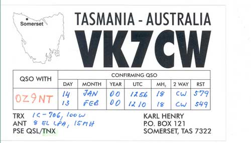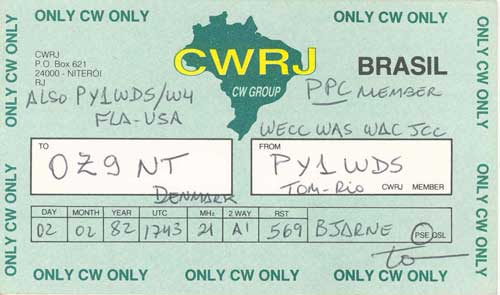 Nedenunder er der afbilledet nogle eksempler på de kort som radioamatører sender til hinanden som bekræftelse på at forbindelsen har fundet sted. Klik på billedet for at se det i stort format og tilbage knappen for at forlade stort billede.