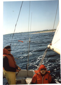 Han havde base i Odense og vi ankom til båden i pinsen 1992 hvor det var varmt og solrigt, men nattekoldt det år. Vi blev installeret og begav os ud gennem kanalen og det var jo ligesom en motorbåd, at styre den. Vi tøffede af sted, - jeg styrede stolt - men da vi var kommet ud af kanalen efter en times tid og der var mere åbent vand foran os, bad min ven mig om at gå op mod vinden og kun lige holde styrefart. Som sagt som gjort og han gik så på dækket og hejste sejl, kom tilbage i cockpittet og tog roret, hvorefter han fangede vinden og nu sejlede vi på en hel anden måde, båden bevægede sig nu som en svane, let og elegant, den gled på bølgerne i stedet for som under motor, at pløje sig gennem vandet. En roligere og behageligere sejlads - meget skønt.
