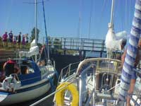 Med de nye gæster ombord satte vi kurs mod nogle steder hvor børnene kunne fiske, hvilket de var helt vilde med, men det var sommer og fiskene holdt også ferie, så der blev ikke fanget noget og efter nogle timer gik vi mod Tunø, men måtte opgive at komme ind, det var for sent på dagen og alle pladser var optaget, selv udenpå havnemolen lå bådene. Vi tog da til Øer havn, gennem en sluse og ind hvor børnebørnene kunne lege, og havde det hyggelig. Slusesejlads! Jo tak vi blev en erfaring rigere.